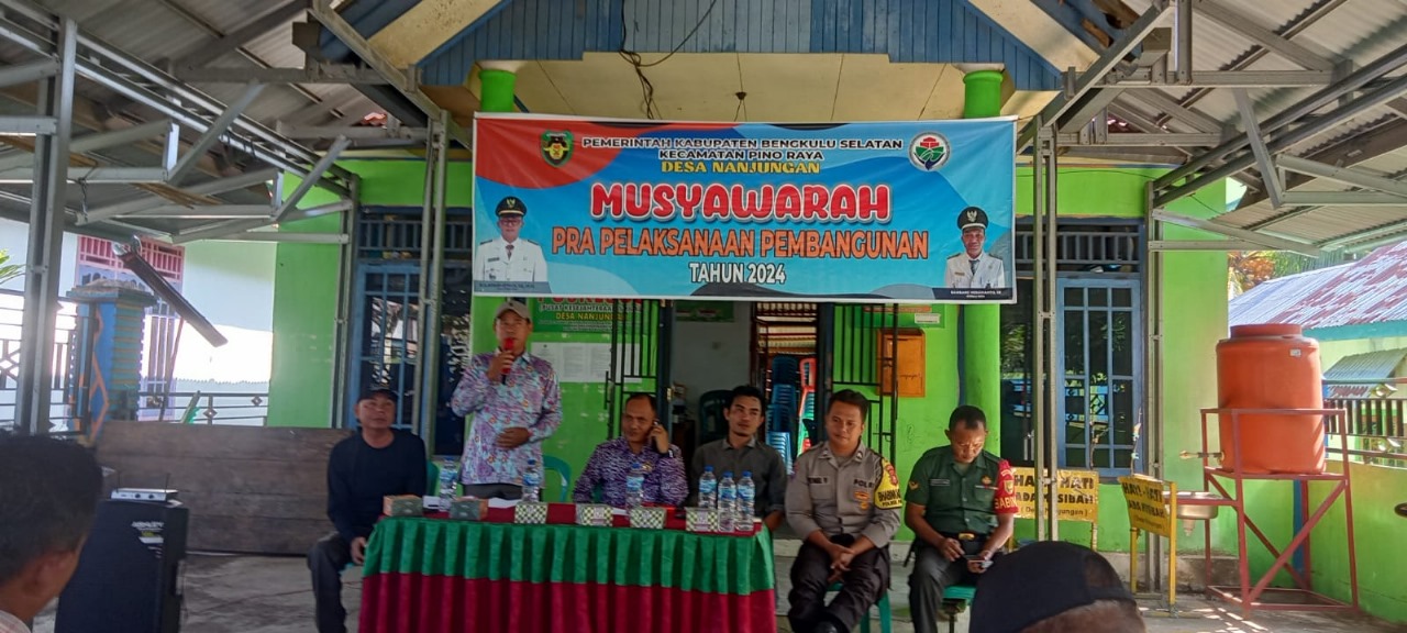 Bengkulu Selatan - Giat Kapolsek Pinoraya IPTU Agus Apriwinata S.Sos M.si diwakili Bhabinkamtibmas BRIPTU Otnel Valentinus, monitor dan Binluh Musdes pra pelaksanaan Pembangunan tahun 2024 di desa Nanjungan Kecamatan Pinoraya Bengkulu Selatan, pada Selasa (04/06/2024) pagi.