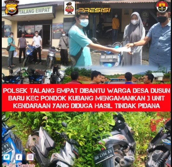 Dutawarta.com - Tiga unit sepeda motor, masing-masing Honda Beat warna hitam BD 4723 KV, kemudian Honda Beat warna silver BD 4194 KV dan Honda Beat warna putih BD 2895 ME, ditemukan oleh warga Desa Dusun Baru Pondok Kubang Kabupaten Bengkulu Tengah bersama petugas Polsek Talang Empat Polres Bengkulu Tengah, Minggu (7/11/2021).