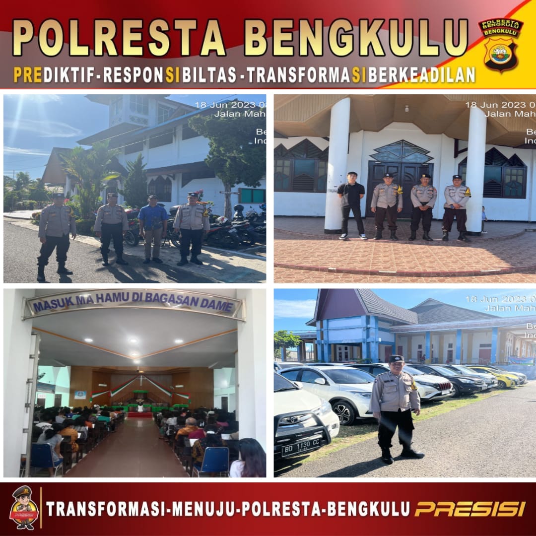 Kota Bengkulu - Anggota Polsek Gading Cempaka Polresta Bengkulu Polda Bengkulu, melaksanakan pengamanan di Gereja HKBP jalan Mahakam III kelurahan Jalan Gedang Gading Cempaka Kota Bengkulu, Minggu (18/06/2023).