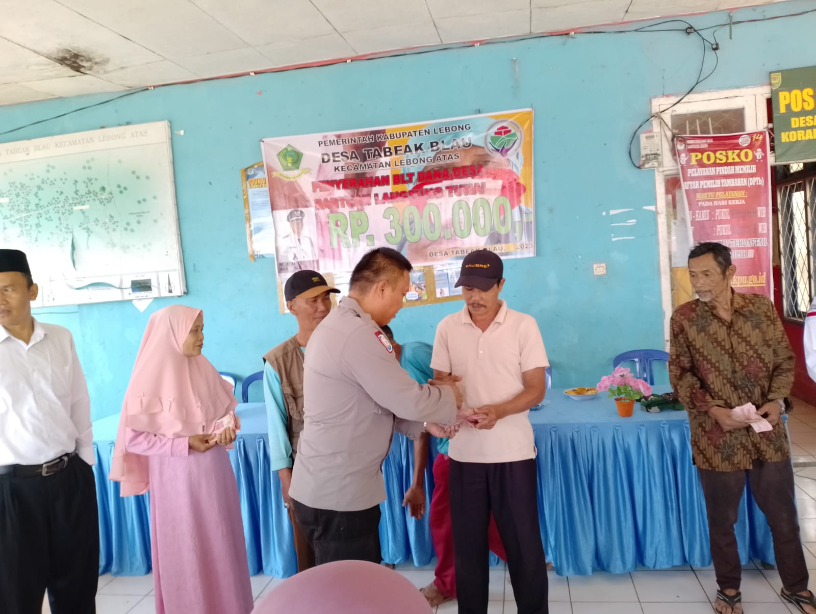 Lebong - Dalam kegiatan sambangnya, Bhabinkamtibmas Polsek Lebong Atas Polres Lebong Polda Bengkulu, Bripka Raden Syahbana, menghadiri kegiatan penyaluran BLT DD di Desa Tabeak Blau, Kecamatan Lebong Utara, Kabupaten Lebong, Selasa (17/10/2023).
