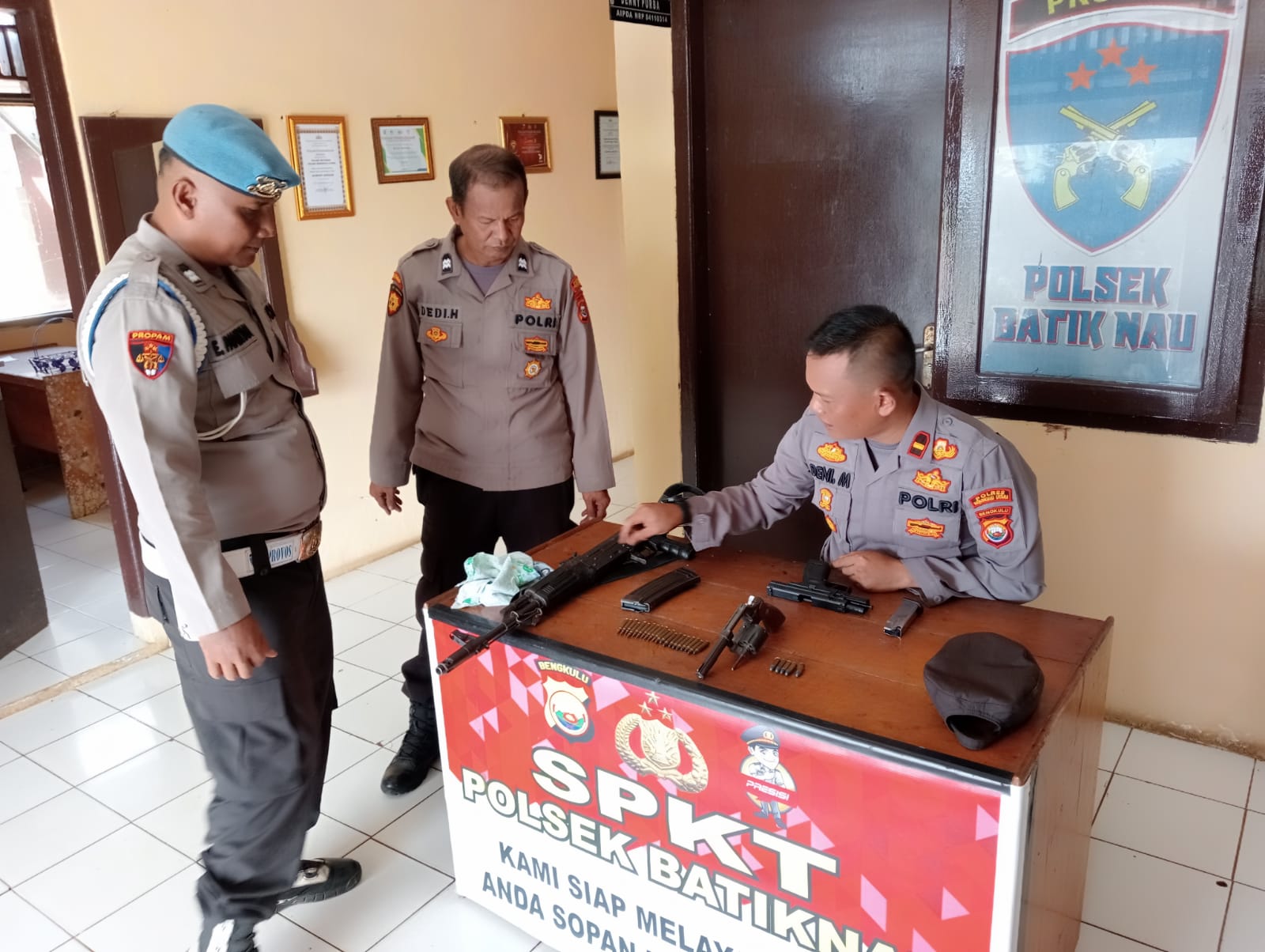 “Pemeriksaan Senpi (senjata api) inventaris Polsek Batiknau dilaksanakan secara rutin dilakukan sedangkan senpi penjagaan dilaksanakan pada saat serah terima penjagaan, dari regu jaga lama diserahkan kepada regu jaga baru yang dipimpin oleh Ka SPK. Dari petugas jaga lama diserahkan kepada petugas jaga baru (Ka SPK) sebagai komandan jaga pada hari itu memeriksa dengan baik itu barang inventaris penjagaan termasuk buku mutasi, tahanan, dan senjata, yang diketahui oleh Ka SPK,” kata Kapolsek.