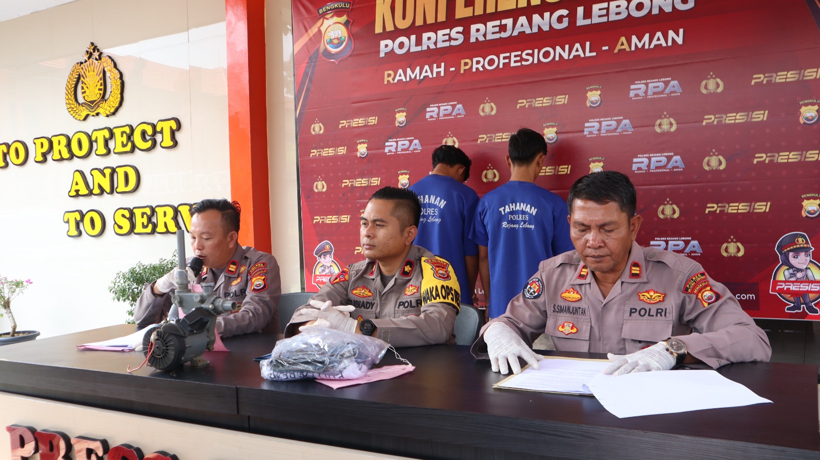 Kapolres Rejang Lebong Polda Bengkulu AKBP Juda Trisno Tampubolon melalui Wakapolres Kompol Yusiady, didampingi Kapolsek Padang Ulak Tanding Iptu Hengki Noprianto, dan Kasi Humas Iptu Sinar Simanjuntak saat press release di Mapolres, Senin (4/9/2023) menerangkan, kedua terduga pelaku beraksi bersama 1 rekannya lagi yang saat ini masih buron.