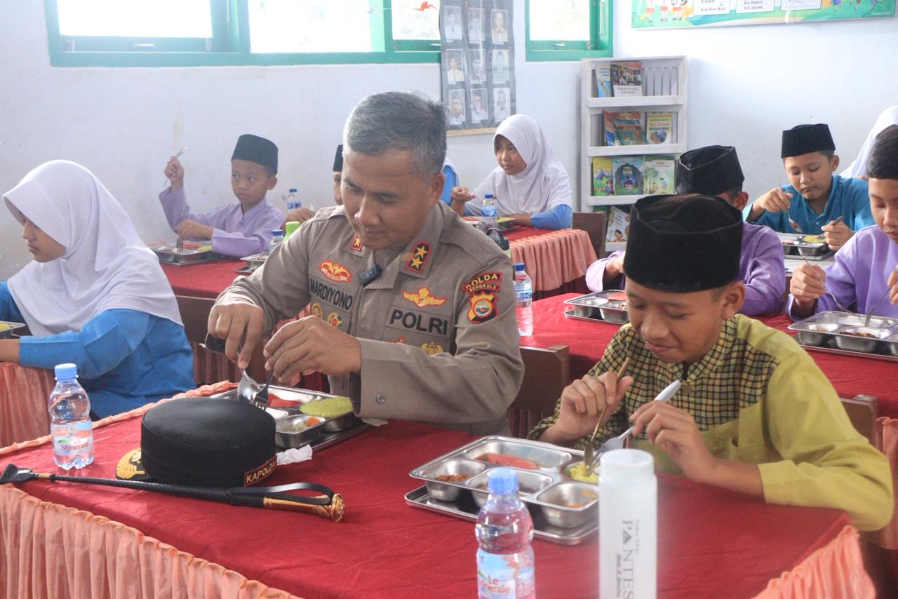 “Saya ingin melihat sendiri bagaimana makanan ini disiapkan, dimasak, hingga benar-benar dinikmati oleh anak-anak. Ini penting agar kita yakin bahwa makanan yang diberikan bukan hanya bergizi, tetapi juga aman dan layak dikonsumsi,” ujar Kapolda Bengkulu Irjen Pol. Mardiyono, S.I.K., M.Si.