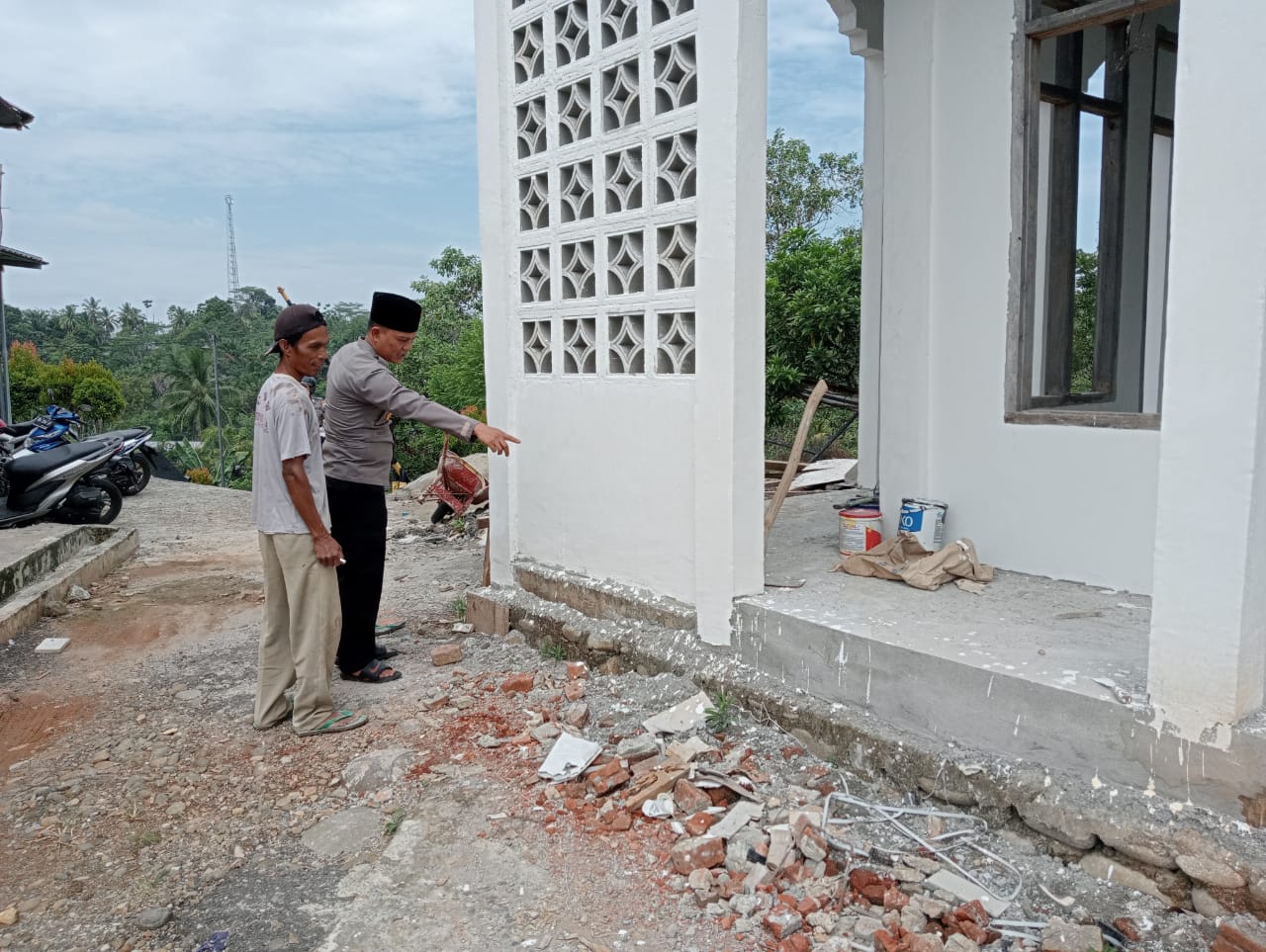 Bengkulu Utara - Kapolsek Batiknau Polres Bengkulu Utara Polda Bengkulu, Ipda Deni Mashuri, S.H., didampingi Kepala tukang Sardi memeriksa Bangunan Mushola yang dibangun oleh para personel Polsek Batiknau Sabtu (10/06/2023).