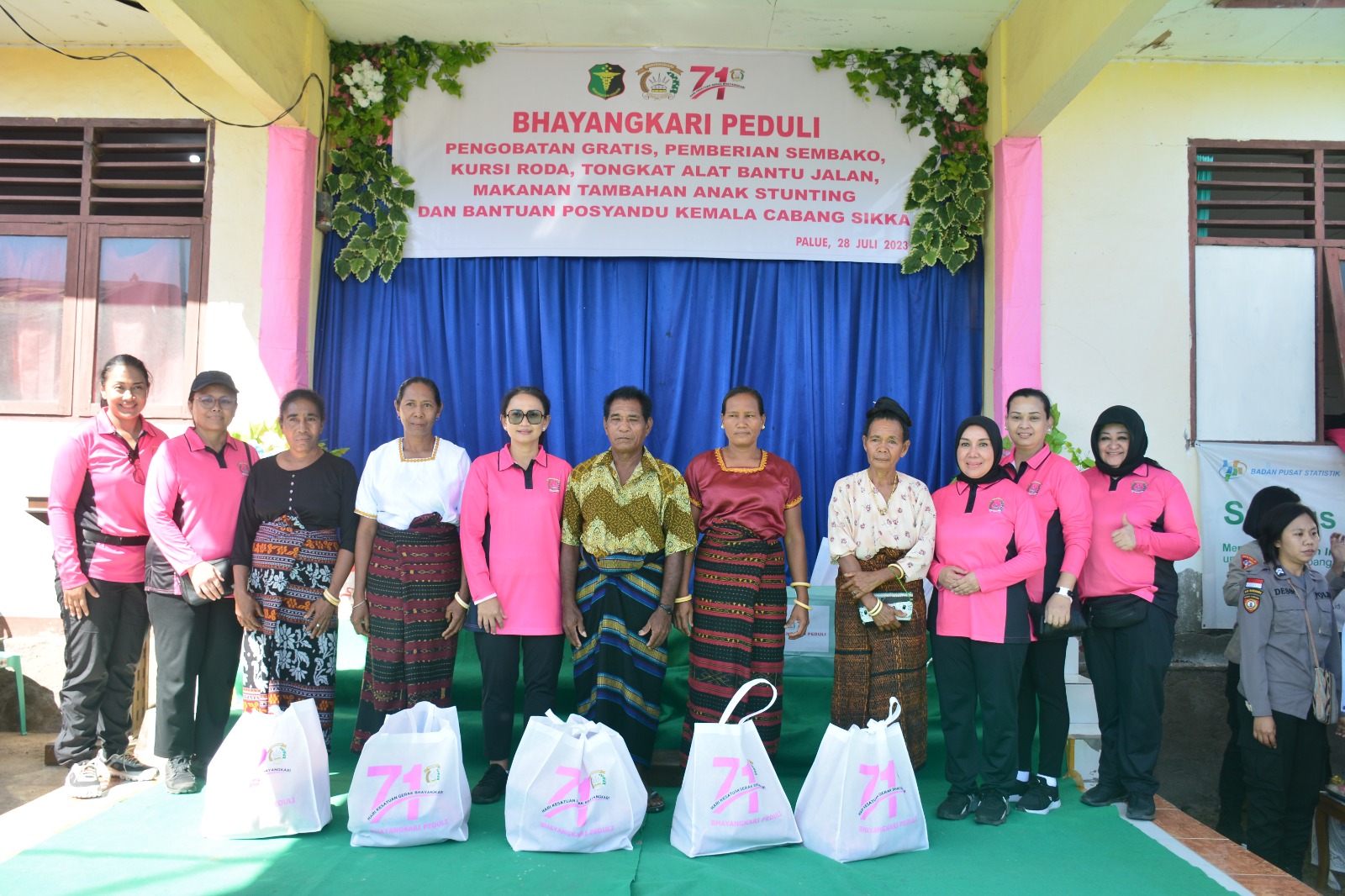 Dari Desa Reruwairere, rombongan Ketua Umum Bhayangkari bergerak menuju Kantor Camat Palue dan memberikan bantuan kepada anak stunting sebanyak 60 paket sembako. Tak hanya itu, bantuan paket sembako juga diberikan kepada penyandang disabilitas, yakni 60 paket sembako dan 21 kursi roda.