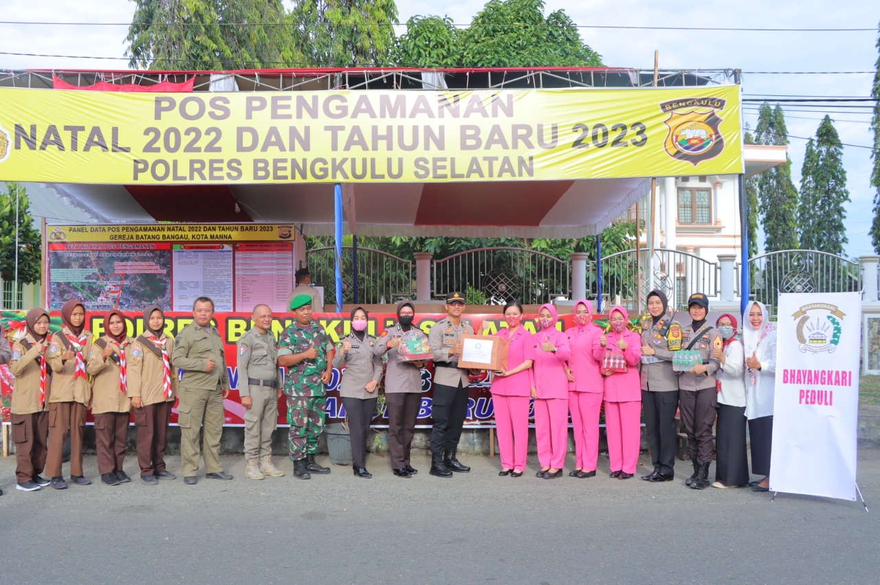 Kunjungi Pos Pam dan Pos Yan Nataru, Bhayangkari Peduli Polres Bengkulu Selatan Bagi Bingkisan