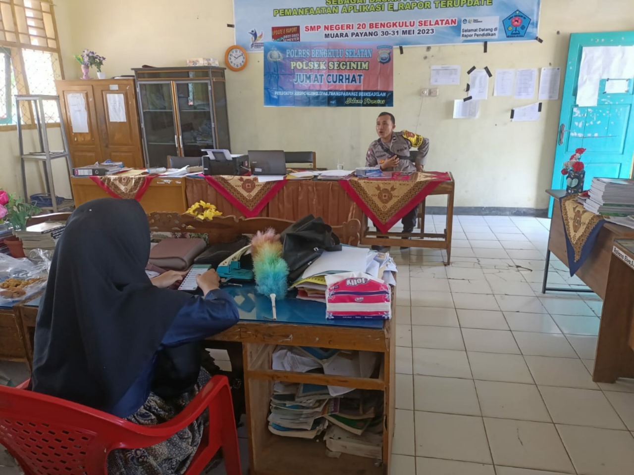 Bengkulu Selatan - Polsek Seginim Polres Bengkulu Selatan Polda Bengkulu melaksanakan Jumat Curhat, di SMPN 20 desa Muara Payang Kecamatan Seginim Kabupaten Bengkulu Selatan, Jumat (15/09/23) Pagi.