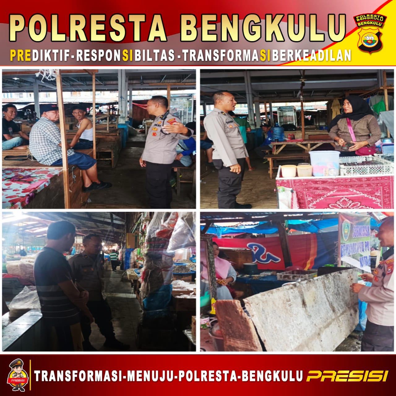 Personel Polsubsektor Pasar Panorama Polsek Gading Cempaka Polresta Bengkulu Polda Bengkulu, melaksanakan kegiatan patroli jalan kaki di kawasan Pasar Panorama BloK T, Pasar Percontohan PPN Blok A dan Blok B Pedagang Pakaian Blok G, Kamis (30/3/2023).