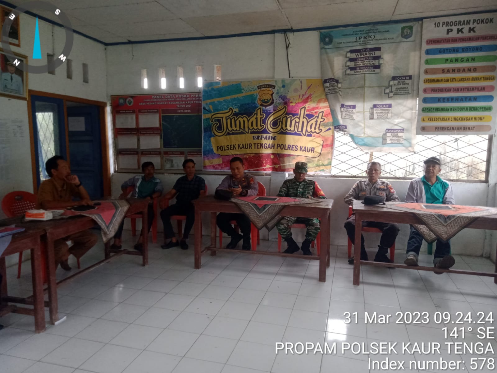 Kaur - Polsek Kaur Tengah Polres Kaur Polda Bengkulu, menggelar Jumat Curhat di Balai Desa Padang Hangat Kecamatan Kaur Tengah Kabupaten Kaur, Jumat (31/3/2023).