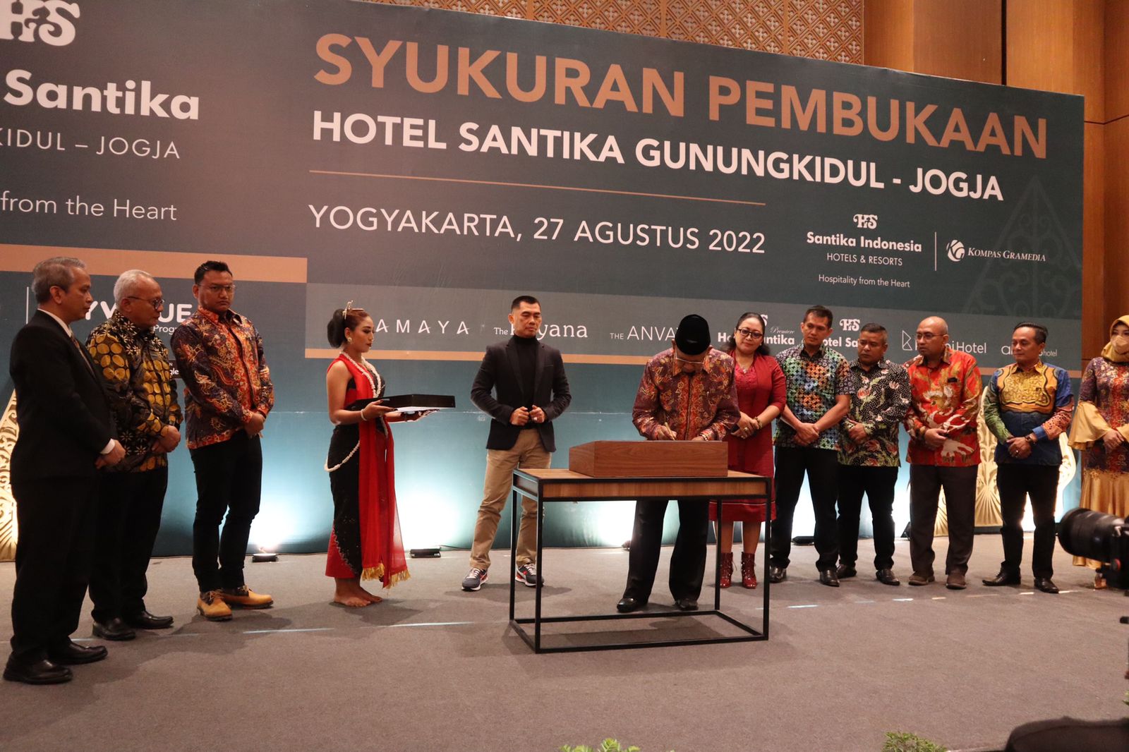 Syukuran Pembukaan Hotel Santika Gunungkidul – Jogja diselenggarakan secara meriah di Amarta Ballroom, Hotel Santika Gunungkidul – Jogja pada hari Jumat, 27 Agustus 2022. Syukuran Pembukaan ditandai dengan penandatanganan prasasti oleh Bupati Gunungkidul, Bapak Sunaryanta, dan juga Komisaris Utama PT Ndalem Tentrem, Bapak Atna Tukiman. Selanjutnya diadakan pemotongan tumpeng sebagai tanda penyerahan Hotel Santika Gunungkidul - Jogja dari PT Ndalem Tentrem kepada Santika Indonesia Hotels & Resorts untuk dioperasikan. Pemotongan tumpeng dilakukan oleh Bapak Bayu Veriwijaya selaku Direktur Utama dari PT Ndalem Tentrem, yang kemudian diteruskan kepada Bapak Andi Wibowo selaku Direktur Operational PT Grahawita Santika dan diserahkan kepada Bapak Setyanto selaku General Manager dari Hotel Santika Gunungkidul – Jogja. Rangkaian acara lainnya adalah pemotongan pita di pintu restaurant Dewi Sri oleh Ibu ketua DPRD, Ibu Endah Subekti Kuntaringsih, Direktur PT Ndalem Tentrem, Ibu Vivit Atnasari dan Ibu Sri Atun.