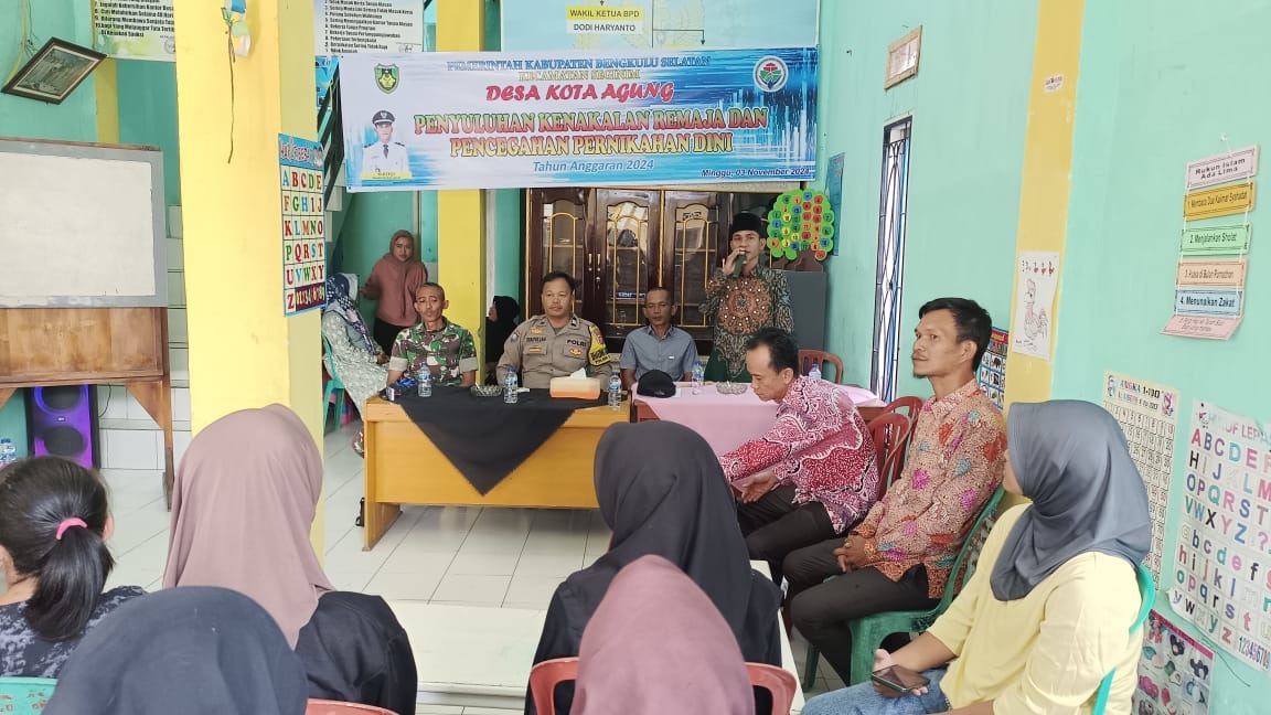 Bengkulu Selatan — Bhabinkamtibmas Polsek Seginim, Polres Bengkulu Selatan, Polda Bengkulu, Aiptu Syaifullah, mengikuti sosialisasi mengenai dampak pernikahan dini tahun anggaran 2024 di Desa Kota Agung, Kecamatan Seginim, Kabupaten Bengkulu Selatan, pada Minggu, 3 November 2024. Kegiatan ini juga menjadi momen untuk memantau situasi kamtibmas di desa binaan.