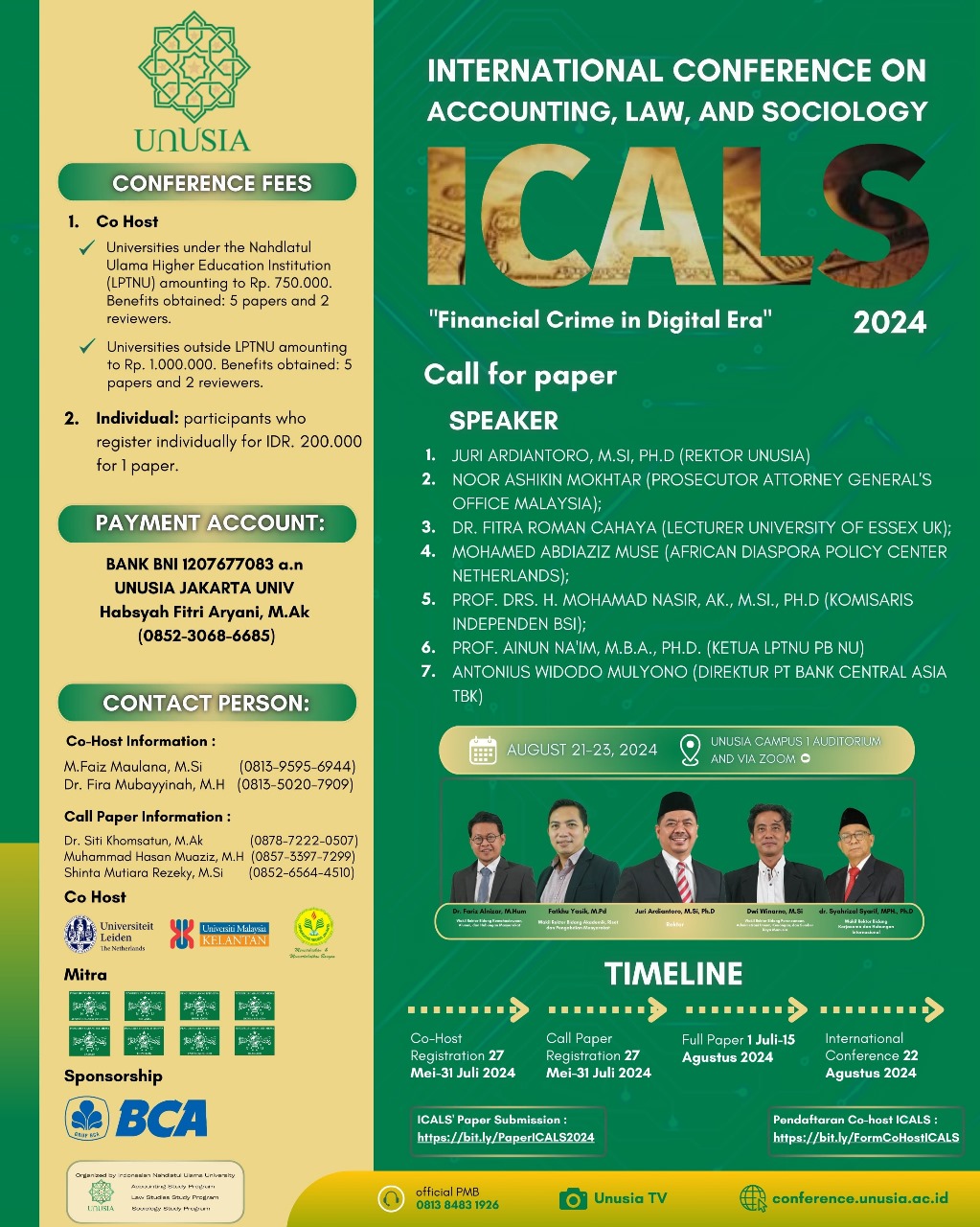 “Kami juga mengajak Perguruan Tinggi, akademisi, praktisi dan mahasiswa untuk berpartisipasi dalam kegaiatan International Conference on Accounting, Law and Sociology (ICALS) 2024 dengan mengirimkan paper melalui https://conference.unusia.ac.id/ sampai dengan 15 Agustus 2024”, terang Wakil Sekretaris Panitia Fira Mubayyinah.