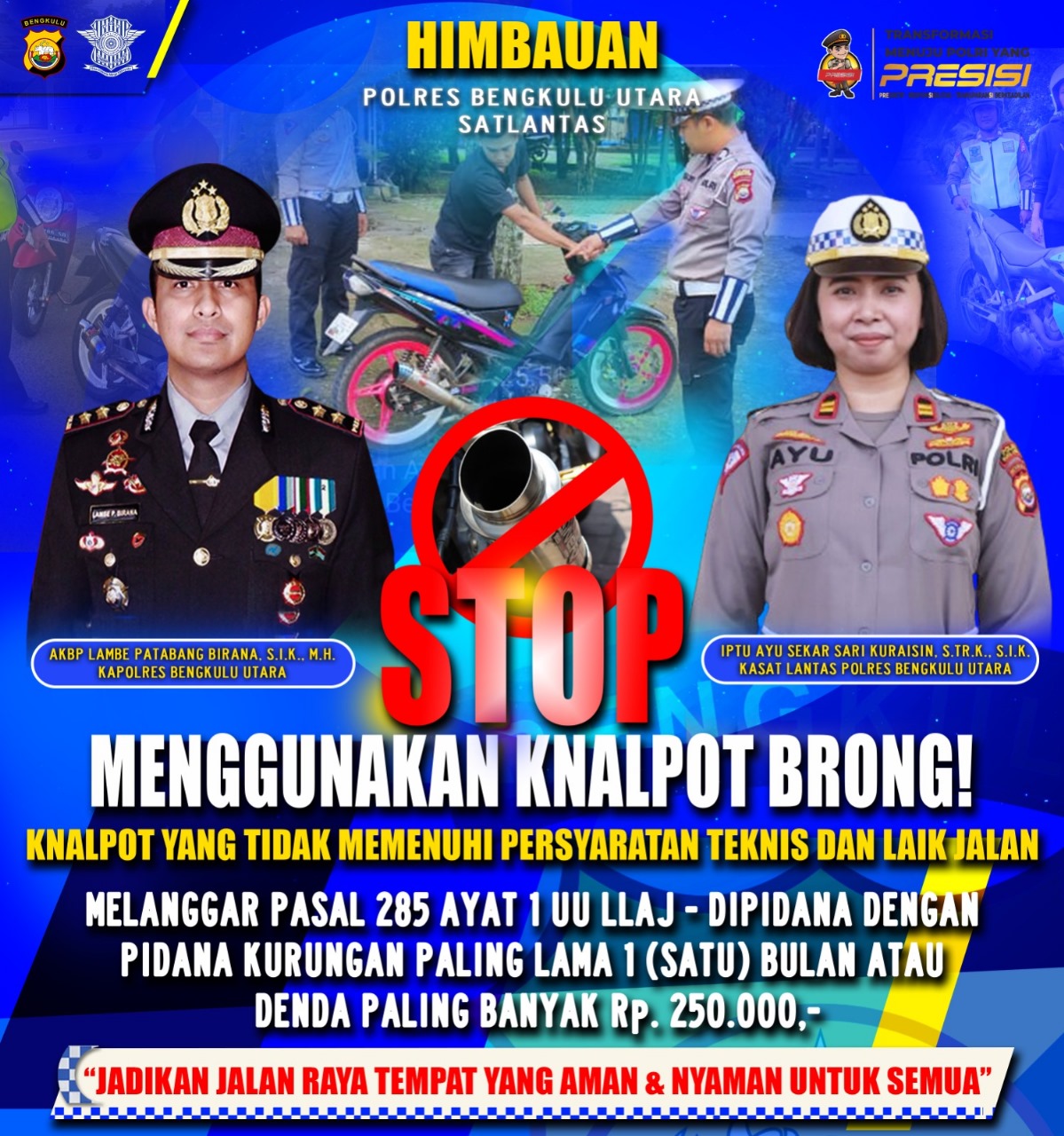 Bengkulu Utara - Kapolres Bengkulu Utara, AKBP Lambe Patabang Birana, S.I.K., M.H., mengimbau kepada masyarakat, khususnya para pengendara sepeda motor, untuk tidak menggunakan knalpot brong. Hal ini disampaikannya dalam rangka menciptakan keamanan dan kenyamanan berlalu lintas di wilayah hukum Polres Bengkulu Utara.