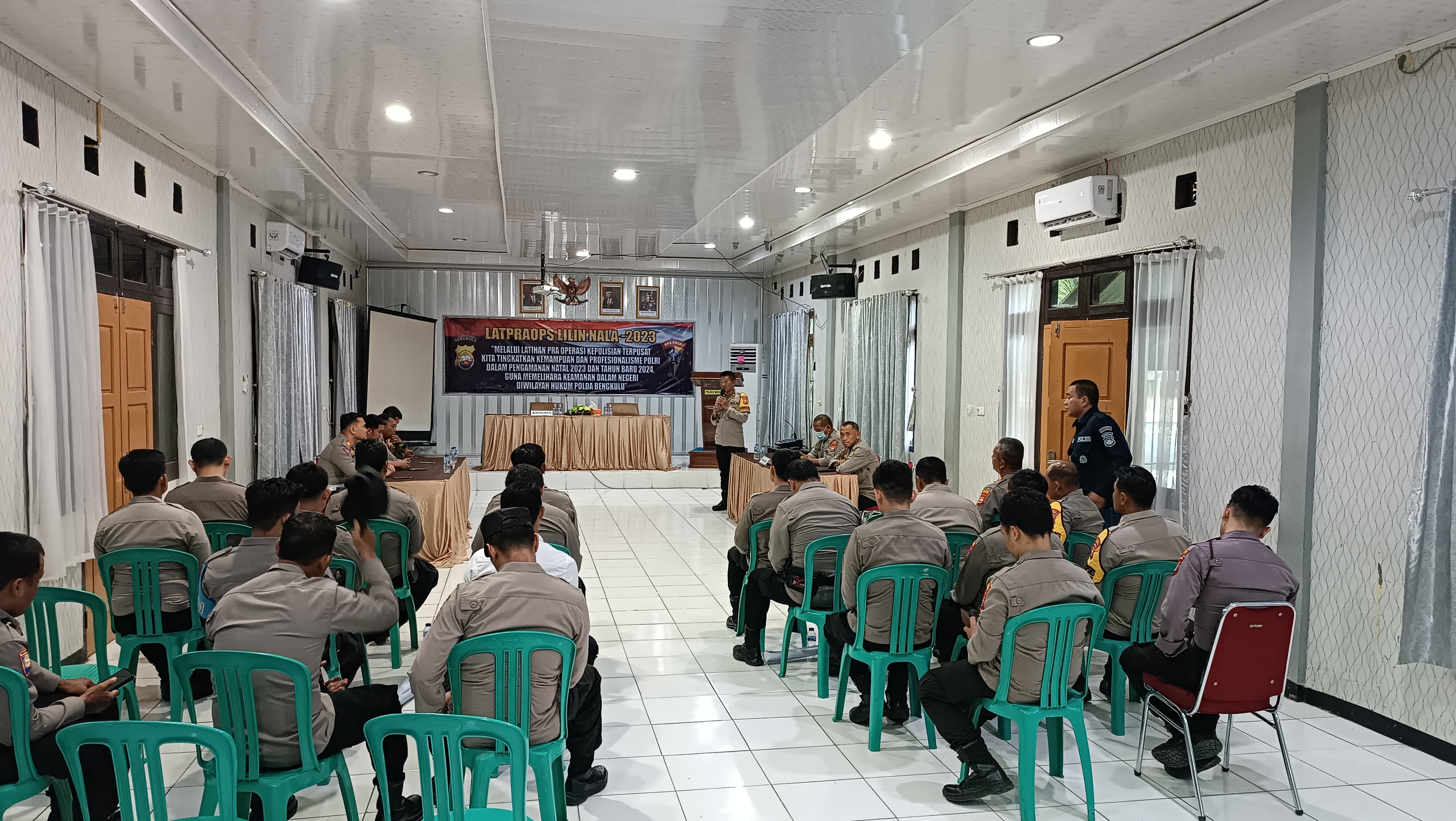 Kegiatan yang digelar di Aula Polres Mukomuko, dihadiri oleh PJU Polres Mukomuko, Kapolsek jajaran dan sejumlah personil yang akan terlibat dalam Operasi Lilin Nala 2023 dengan tema “Melalui Latihan Pra Operasi Kita Tingkatkan Kemampuan Dan Profesionalisme Polri Dalam Pengamanan Natal 2023 Dan Tahun Baru 2024, Guna Memelihara Keamanan Dalam Negeri”.