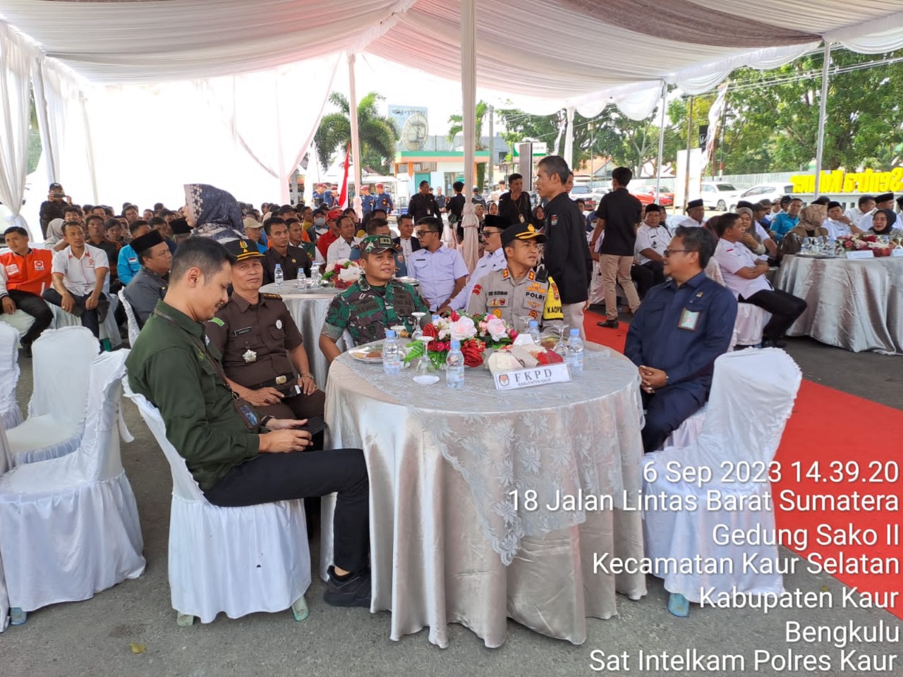 Kaur - Kapolres Kaur Polda Bengkulu AKBP Eko Budima, menghadiri kegiatan serah terima Kirab Pemilu Tahun 2024 dari KPU Bengkulu Selatan Ke KPU Kaur dengan tema Pemilu Sebagai Sarana Integrasi Bangsa, bertempat di Halaman Gedung Sentral Kuliner Kab. Kaur, Rabu (06/09/2023).