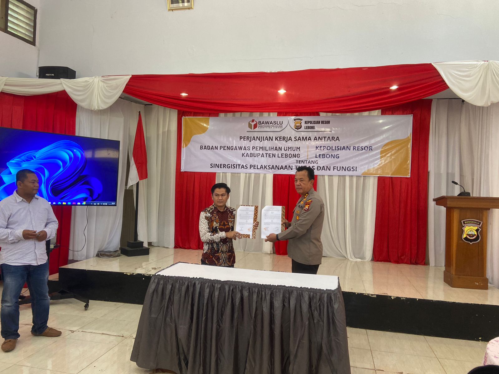 Lebong - Kapolres Lebong Polda Bengkulu AKBP Awilzan, meneken perjanjian kerjasama dengan Bawaslu Lebong. kegiatan berlangsung di Aula Polres Lebong, Jumat (13/10/2023).