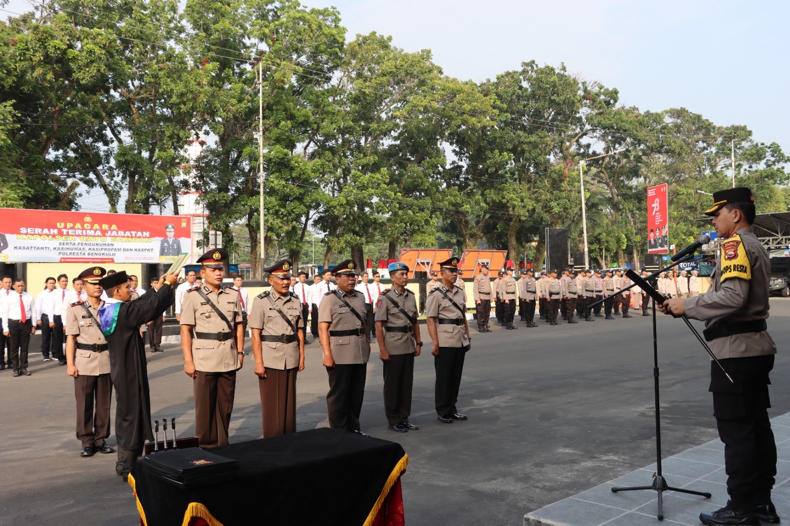 Bengkulu - Kapolresta Bengkulu Polda Bengkulu Kombes Pol Aris Sulistyono memimpin Sertijab dan pengukuhan jabatan Kapolsek Ratu Samban, Kasat Tahti, Kasi Propam, Kasi Humas dan Kepala SPKT Polresta Bengkulu, Selasa (5/9/2023) di Lapangan Apel Polresta Bengkulu.