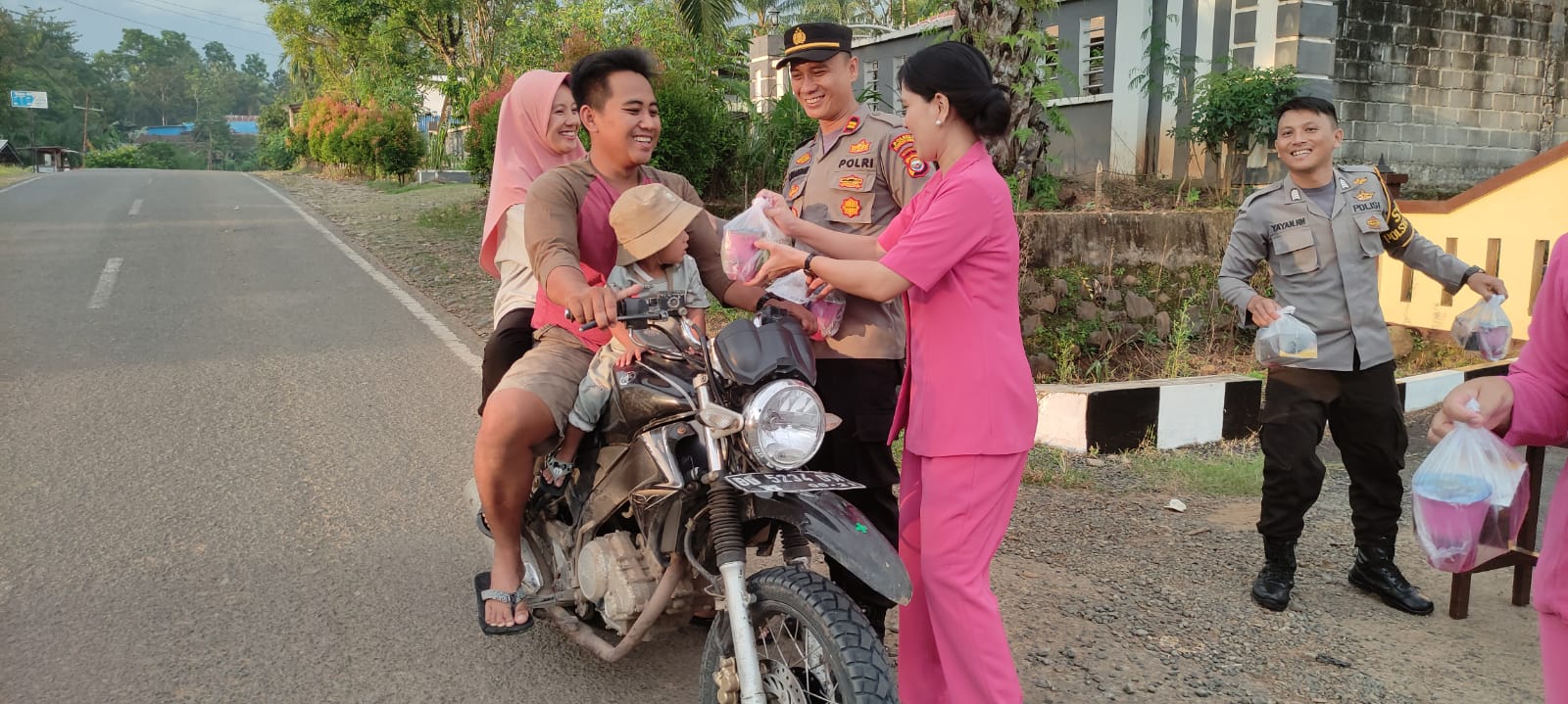 Kapolsek Giri Mulya Iptu Freddy Simaremare, S.H bersama Ketua Bhayangkari Ranting Giri Mulya Ny. Yunia Simaremare dan Bhayangkari serta Personel Polsek Giri Mulya melaksanakan pembagian takjil kepada masyarakat di depan Mako Polsek Giri Mulya, Polres Bengkulu Utara Polda Bengkulu.