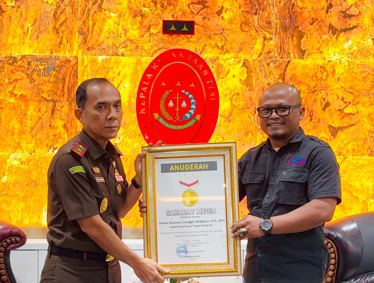 Bengkulu - Kepala Kejaksaan Tinggi (Kajati) Bengkulu, Viktor Antonius Saragih Sidabutar, menerima anugerah "Sahabat Media" dari Serikat Media Siber Indonesia (SMSI) Bengkulu. Penghargaan tersebut diberikan oleh SMSI Bengkulu, usai audiensi pengurus SMSI dengan Kajati Bengkulu, di ruang kerjanya, Kamis (3/7/2025).