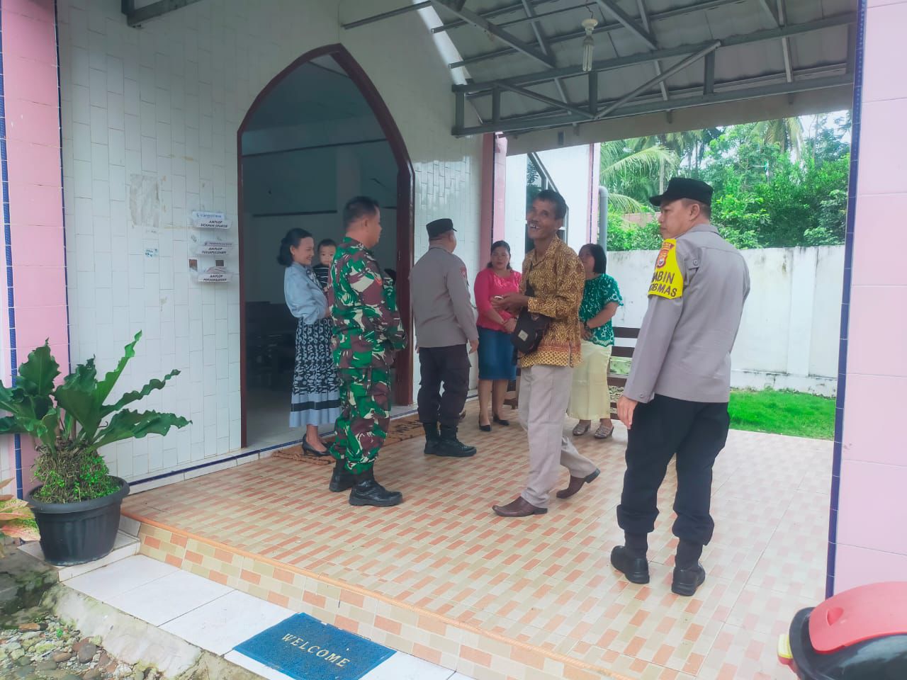 Anggota piket Polsek Sukaraja bersama dengan anggota TNI dari koramil Air Periukan melaksanakan Giat Minggu Kasih kepada para Jamaat dan pengurus Gereja GPDI Desa Lokasi Baru kec. Air Periukan Kab.Seluma