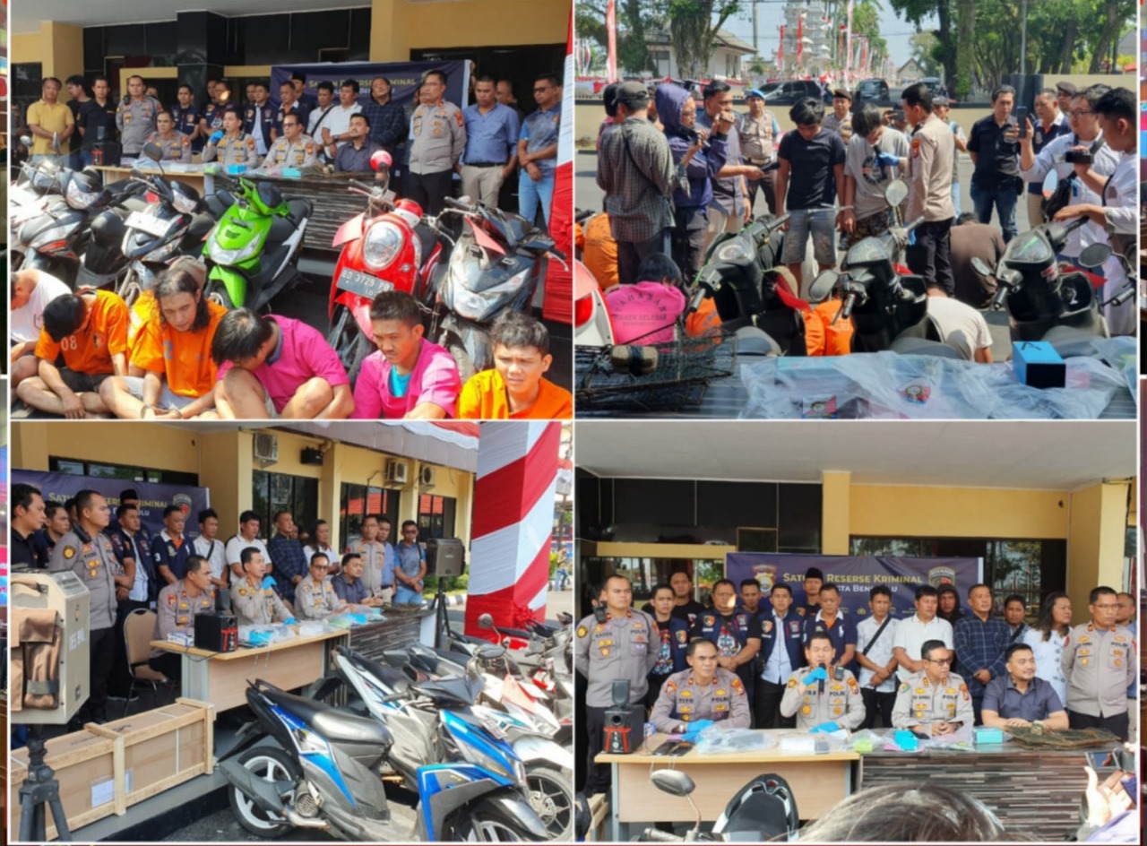 ”Polresta Bengkulu berhasil 25 kasus curat, 3 curas, 4 curanmor, dan menangkap total 42 tersangka, yang dimana 40 tersangka pria, dan 2 tersangka wanita dan kedua tersangka itu melakukan tindak pidana curat, dan dari 42 tersangka, ada 4 tersangka residivis,” tutur Kombes Pol Aris Sulistyono, S.H., M.H.
