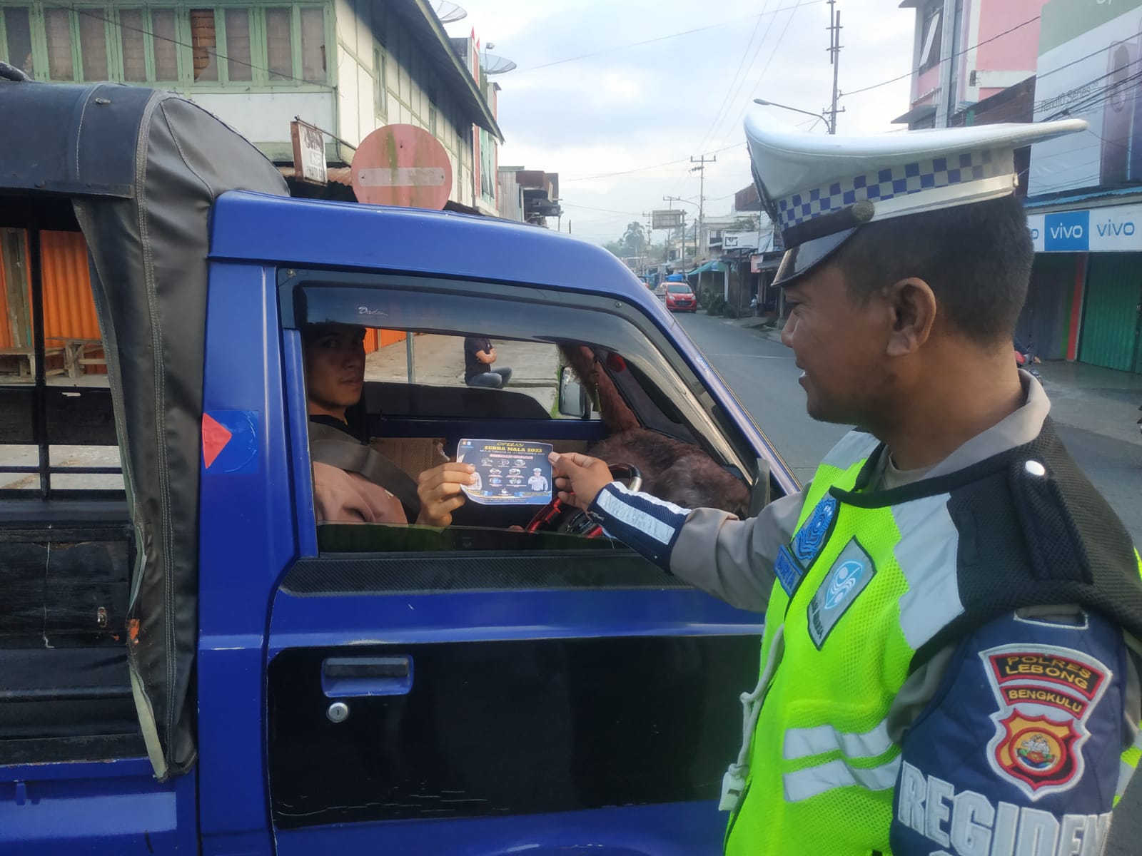 Lebong - Dalam rangka Operasi Zebra Nala 2023, Satgas Preemtif Satlantas Polres Lebong Polda Bengkulu, membagikan brosur dan menempelkan stiker pada kendaraan warga.