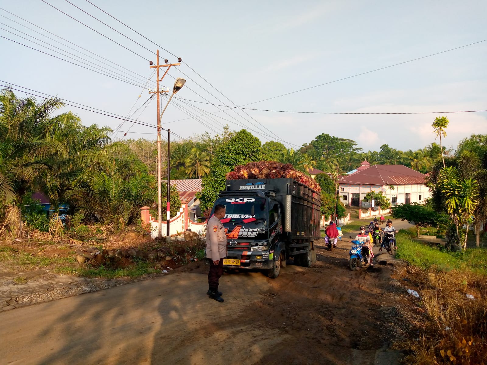 Personel Polsek Padang Jaya, Bantu Pengamanan Lalin Truk yang Mengalami Kerusakan