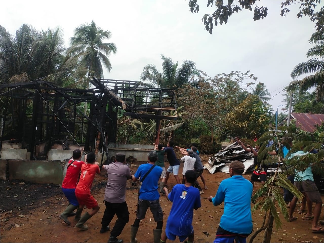 Bengkulu Utara - Polsek Giri Mulya Polres Bengkulu Utara Polda Bengkulu, melaksanakan Gotong Royong bersama dengan warga membersihkan Puing-puing bangunan rumah warga yang terkena musibah Kebakaran di Desa Giri Mulya Kecamatan Giri Mulya, Sabtu (09/09/2023).