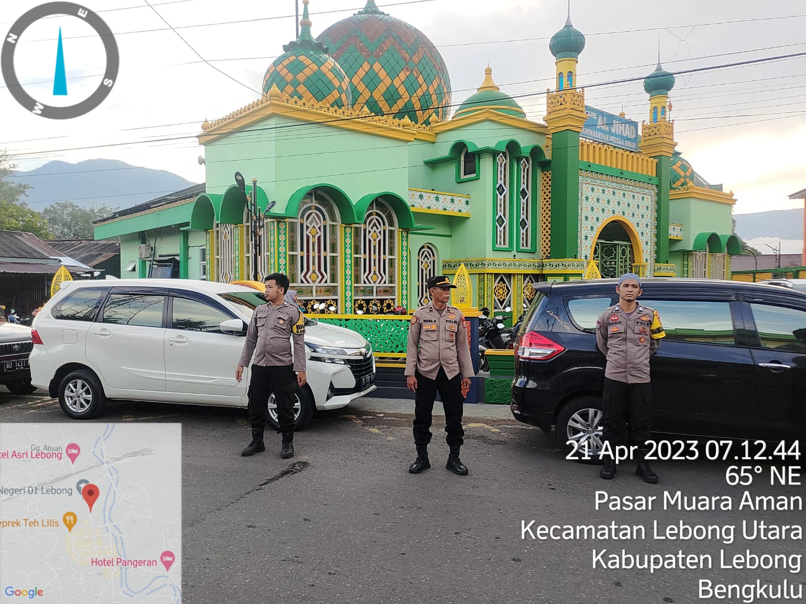 Lebong - Personel Polsek Lebong Utara Polres Lebong Polda Bengkulu melaksanakan kegiatan pengamanan pelaksanaan ibadah Salat Idulfitri 1444 Hijriah di Masjid Muhammadiyah Kelurahan Pasar Muara Aman Kabupaten Lebong, Jumat (21/4/2023) pagi.