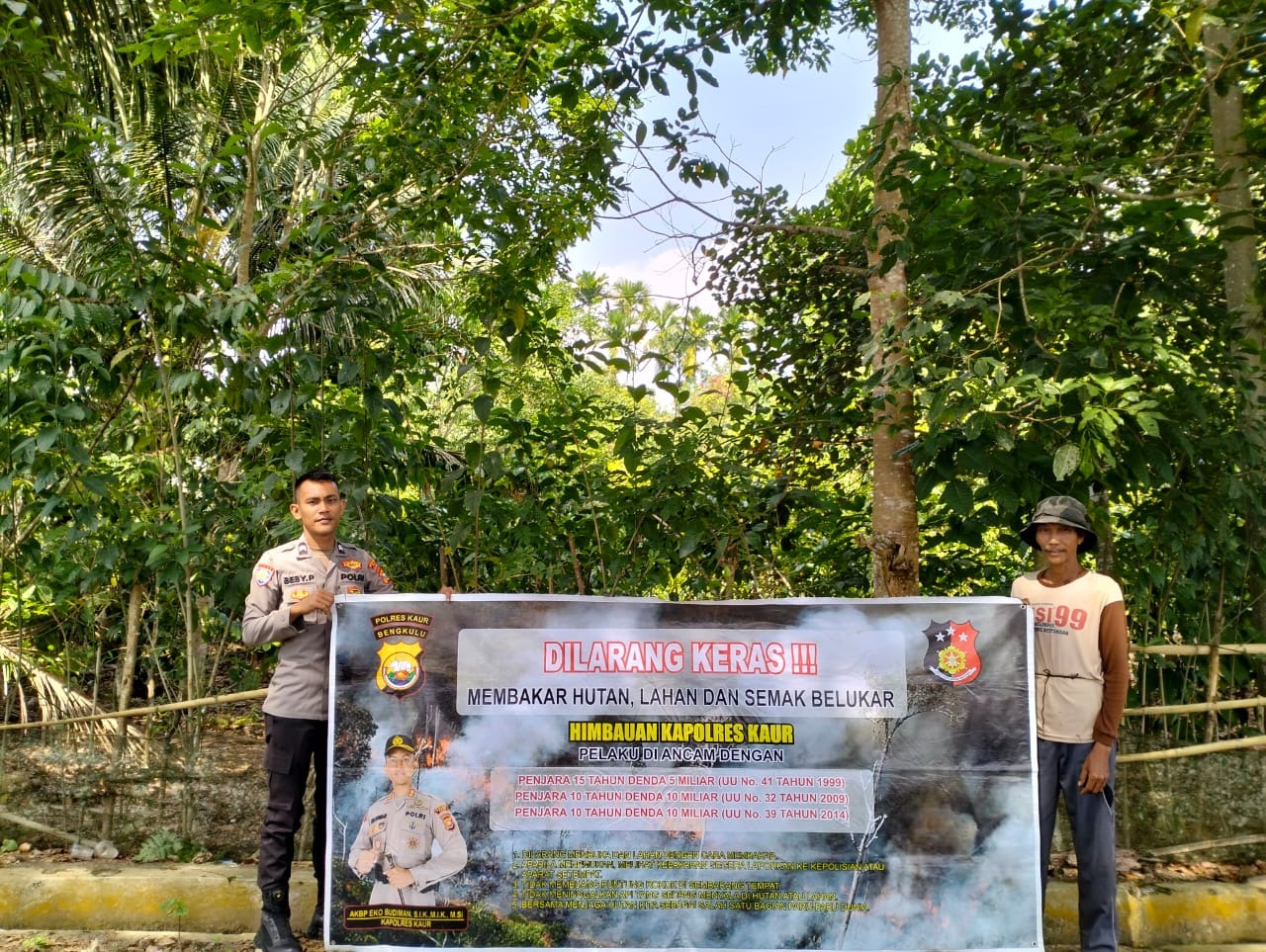 Personel Polsek Padang Guci Hulu Aipda Oktadin, W berserta Bripka Rohandi, S.H, menyampaikan himbauan Kapolres Kaur AKBP Eko Budiman, S.I.K., M.I.K., M.Si tentang larangan membakar hutan, lahan dan semak belukar, personel juga mengajak warga untuk sama-sama peduli dan mencegah warga lainnya untuk melakukan pembakaran lahan serta mau membantu memadamkan apabila ditemukan adanya kebakaran hutan dan lahan.