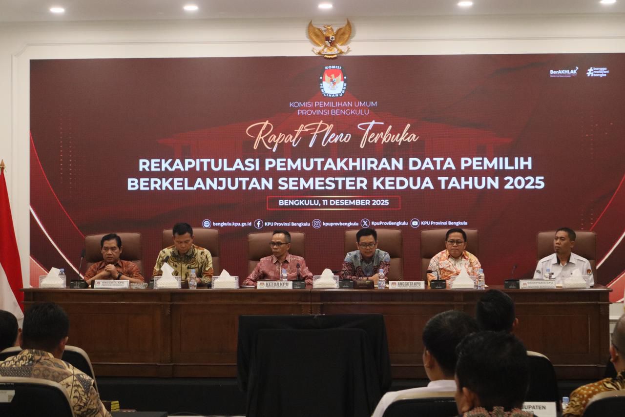 Bengkulu, 11 Desember 2025 — Kantor Wilayah Direktorat Jenderal Pemasyarakatan (Kanwil Ditjenpas) Bengkulu menghadiri Rapat Pleno Terbuka “Rekapitulasi Pemutakhiran Data Pemilih Berkelanjutan Semester Kedua Tahun 2025” yang diselenggarakan oleh Komisi Pemilihan Umum (KPU) Provinsi Bengkulu pada Kamis, 11 Desember 2025. Kegiatan berlangsung di Aula Demokrasi KPU Provinsi Bengkulu mulai pukul 09.00 WIB hingga selesai, dengan kehadiran Kepala Bidang Pembimbing Kemasyarakatan sebagai perwakilan Kanwil Ditjenpas Bengkulu.