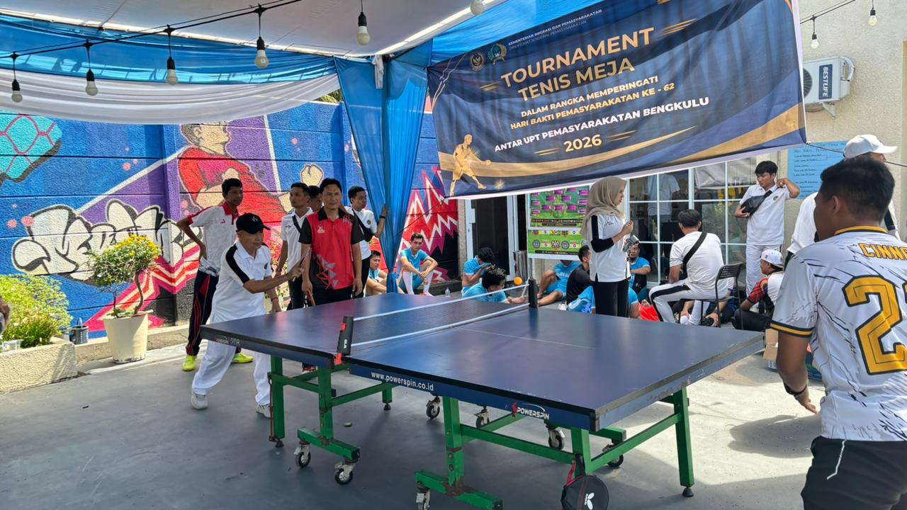 Bengkulu – Dalam rangka memeriahkan Hari Bakti Pemasyarakatan ke-62, jajaran Unit Pelaksana Teknis (UPT) Pemasyarakatan se-Provinsi Bengkulu menggelar turnamen tenis meja antar UPT yang berlangsung dengan penuh antusias dan semangat kebersamaan.