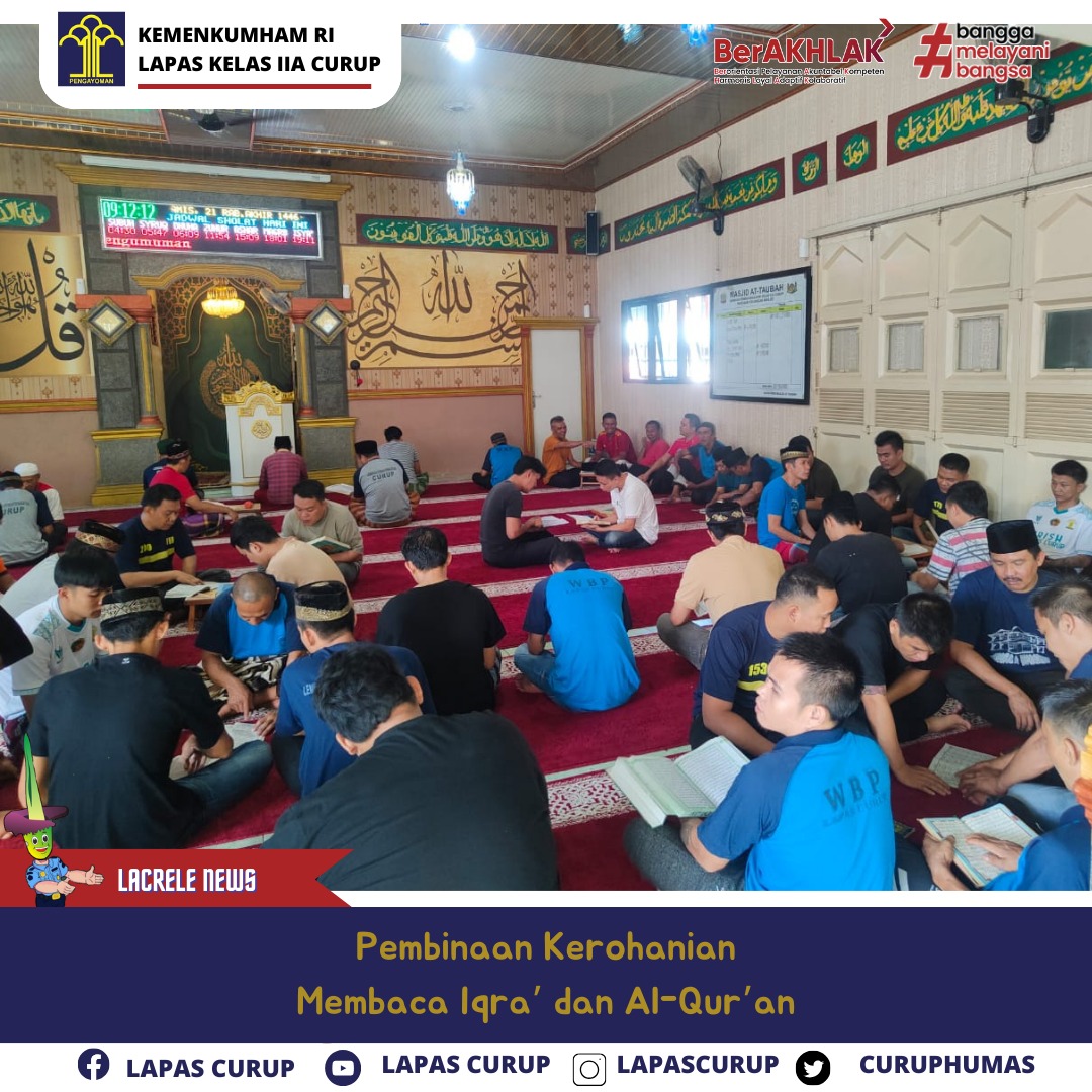 Curup - Program pembinaan kerohanian Kegiatan belajar iqra' dan alqur'an WBP Lapas Klas II A Curup. Sabtu (26/10) Dalam upaya agar pengetahuan dan pemahaman keagamaan WBP dapat terus meningkat  yang berdasarkan pada Peraturan Pemerintah No. 99 Tahun 2012 tentang syarat dan tata cara pelaksanaan Hak Warga Binaan Pemasyarakatan, Lapas Klas II A curup terus berupaya untuk mengoptimalkan  dan meningkatkan kualitas program pembinaan kerohanian pembelajaran iqra' dan Alqur'an bagi WBP yang mana kegiatan ini sudah rutin dilaksanakan secara bergantian dan terjadwal pada masing - masing blok hunian dalam setiap harinya.