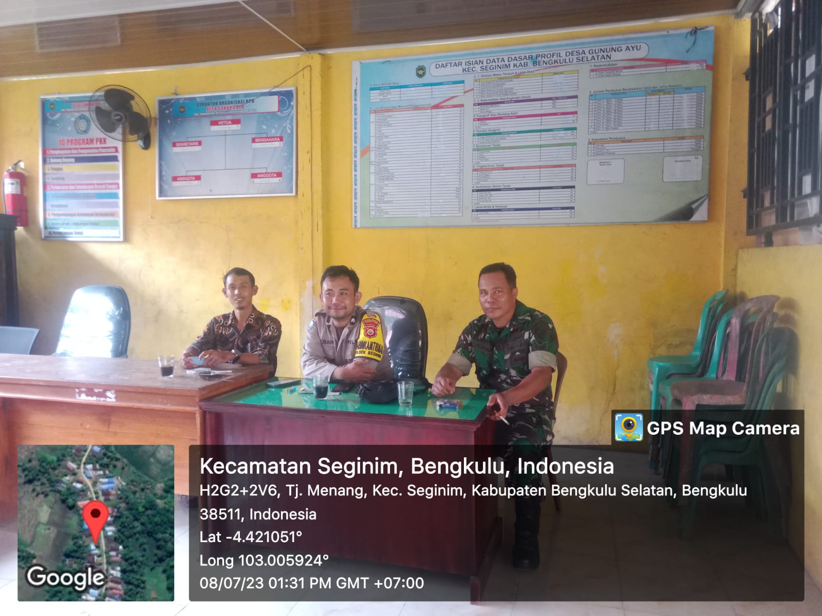 Bengkulu Selatan - Bhabinkamtibmas Polsek Seginim Polres Bengkulu Selatan Polda Bengkulu Briptu Retno Akbar dan Babinsa menghadiri kegiatan musdes kegiatan rencana Buji'an dusun Bupati Bengkulu Selatan didesa Gunung Ayu Kecamatan Seginim Kabupaten Bengkulu Selatan, Sabtu (08/07/23).