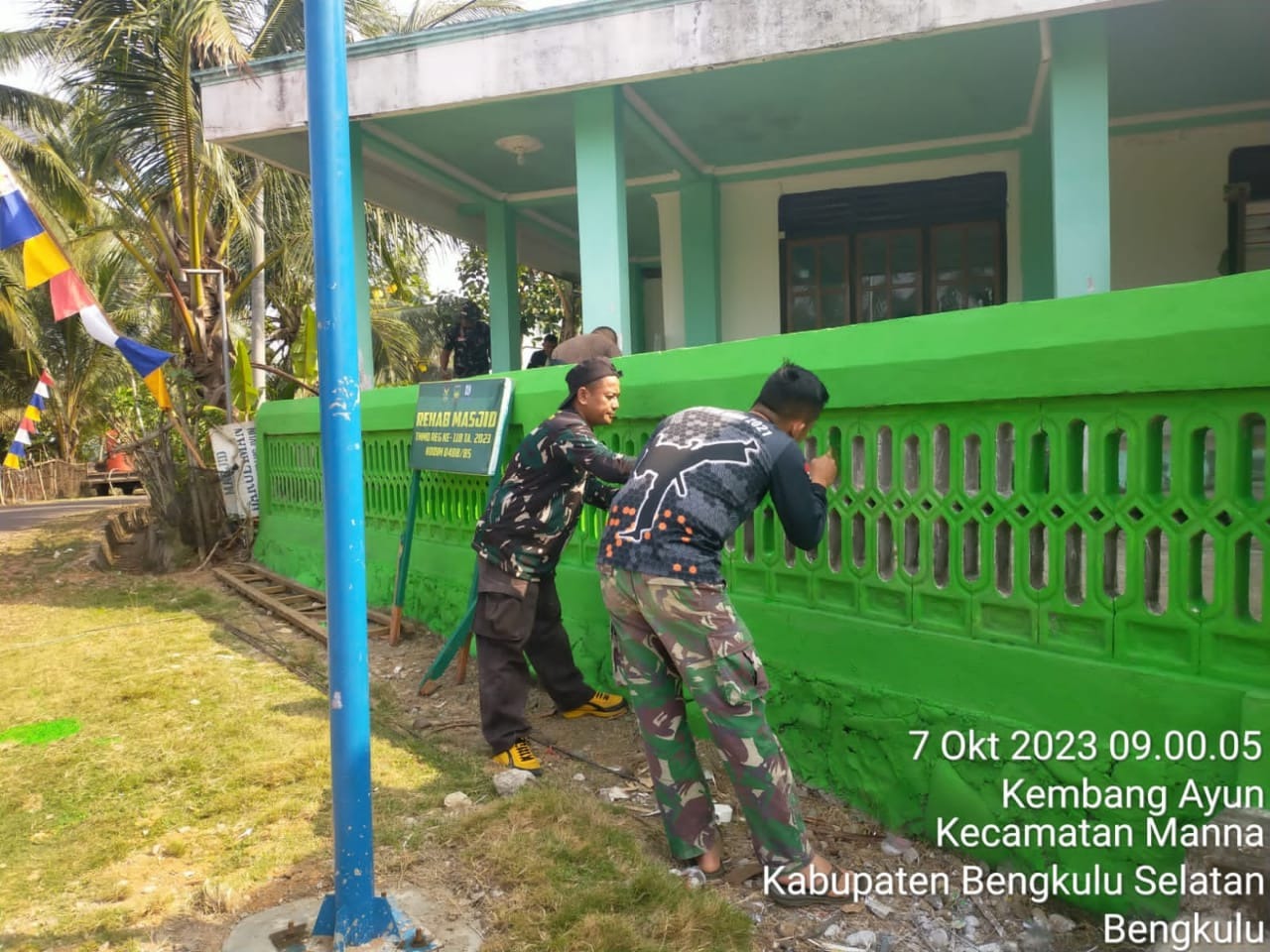Bengkulu Selatan – Sinergitas TNI-Polri hingga masyarakat terlihat dalam kegiatan TNI Manunggal Membangun Desa (TMMD) Reguler ke-118 Kodim 0408 BSK Tahap I Tahun Anggaran 2023, personel Polres Bengkulu Selatan Polda Bengkulu aktif terjun lapangan bahu membahu ikut merehab Masjid dan Pos Kamling, di desa Kembang Ayun Kecamatan Manna Bengkulu Selatan, pada Sabtu( 07/10/23).