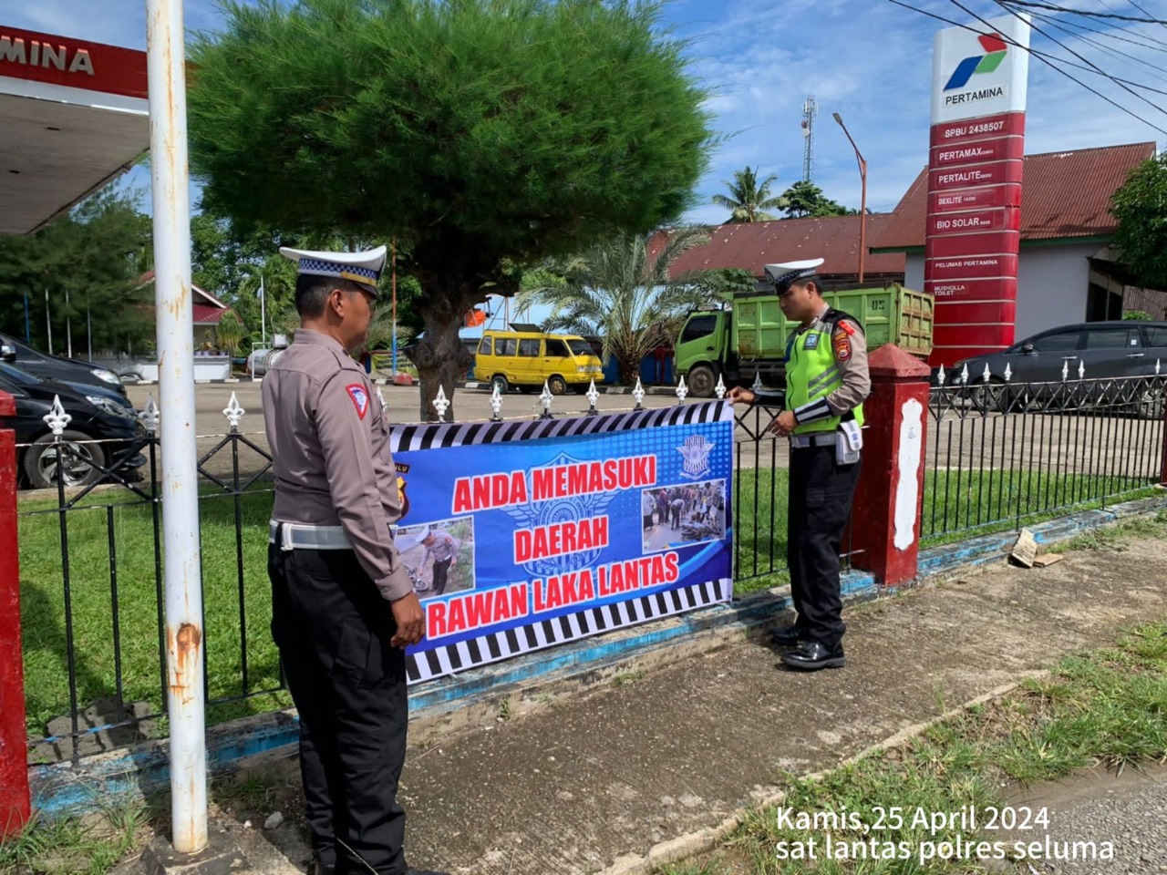 Seluma - Kamis (25/04/2024) personel Sat Lantas Polres Seluma Polda Bengkulu, yang tergabung dalam unit Kamsel dipimpin oleh Ipda Rastam melaksanakan giat imbauan keamanan dalam berlalu lintas dengan lokasi Simpang Enam kabupaten Seluma dan SPBU kelurahan Pasar Tais Kabupaten Seluma.