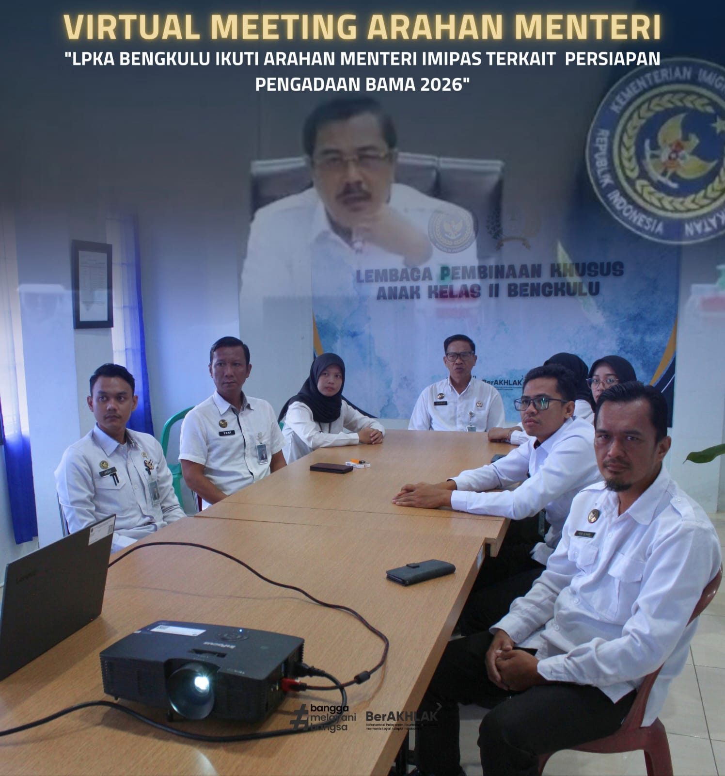 Bengkulu, 4 Desember 2025 — Lembaga Pembinaan Khusus Anak (LPKA) Kelas II Bengkulu mengikuti virtual meeting yang digelar Kementerian Imigrasi dan Pemasyarakatan bersama Menteri baru, Komjen Pol (Purn) Agus Andrianto, S.H., M.H. Pertemuan tersebut membahas secara khusus persiapan pelaksanaan pengadaan Bahan Makanan (BAMA) untuk Tahun Anggaran 2026 di seluruh Unit Pelaksana Teknis (UPT).
