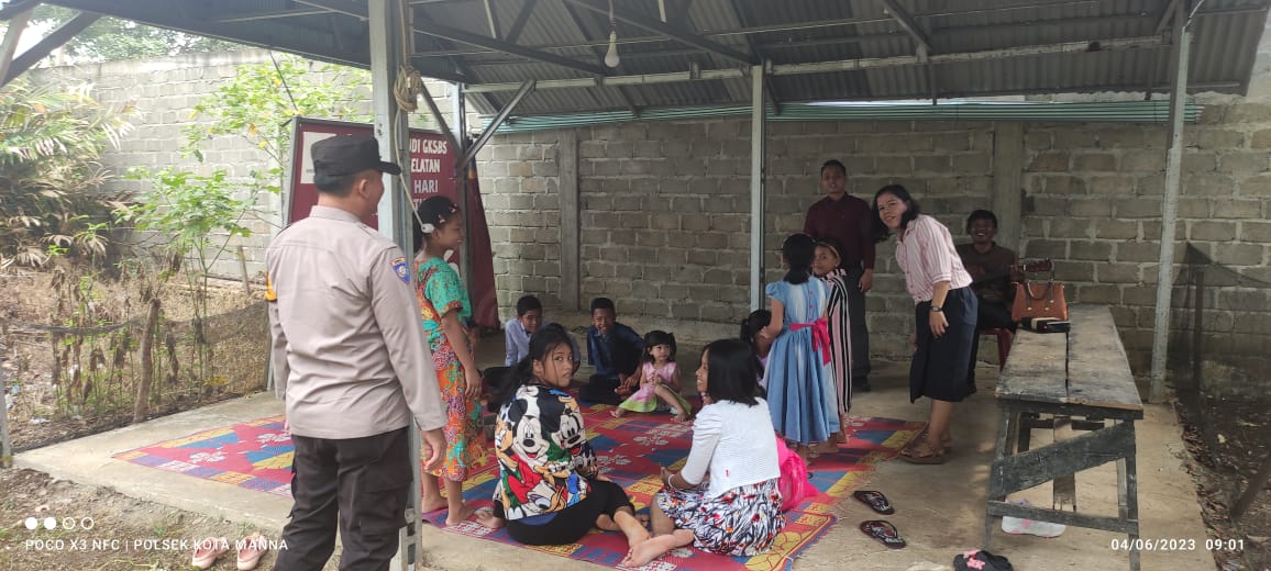 Bengkulu Selatan, - Ibadah Minggu aman, Bhabinkamtibmas Polsek Kota Manna Polres Bengkulu Selatan Rutin melakukan Pengamanan Gereja di Wilayah Hkum Polres Bengkulu Selatan, Minggu (04/06/2023).